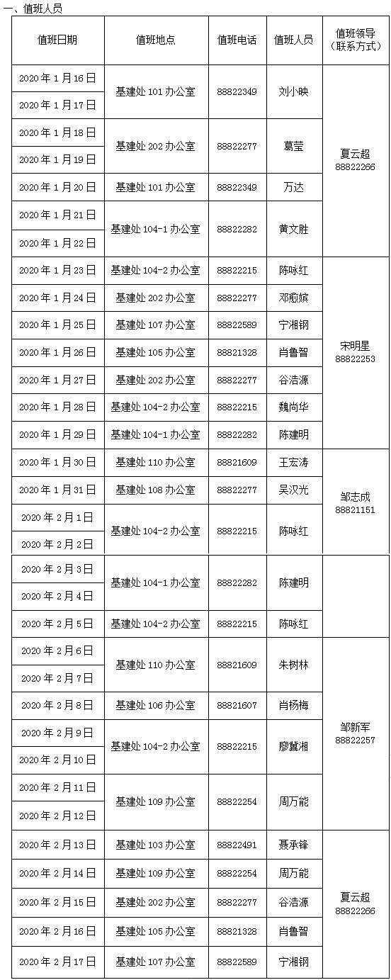 注:春节期间(1月24日-30日)坐班值班,1月19日(星期日)、2月1日(星期六)坐班值班,寒假期间的其他时间周一至周五坐班值班,周末电话值班。但疫情防控期间,值班领导及值班人员每天均需坐班值班。寒假值班时间为上午8:30-11:30,下午15:00-17:30。