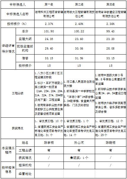 根据招标投标相关法律法规及招标文件的规定,湖南大学德智园研究生公寓(一期)工程项目监理2019年3月21日在湖南省公共资源交易中心开标、评标,本项目采用湘建监督[2018]240号文件中综合评估法的评标办法,评标委员会推荐了以下3名中标候选人(排序),现将相关信息予以公示。公示期2019年3月26日至2019年3月28日。